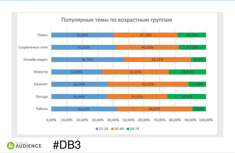 Важно обратить внимание на почти 25% взрослой (50-74 года) аудитории у новостных сайтов и погодных.