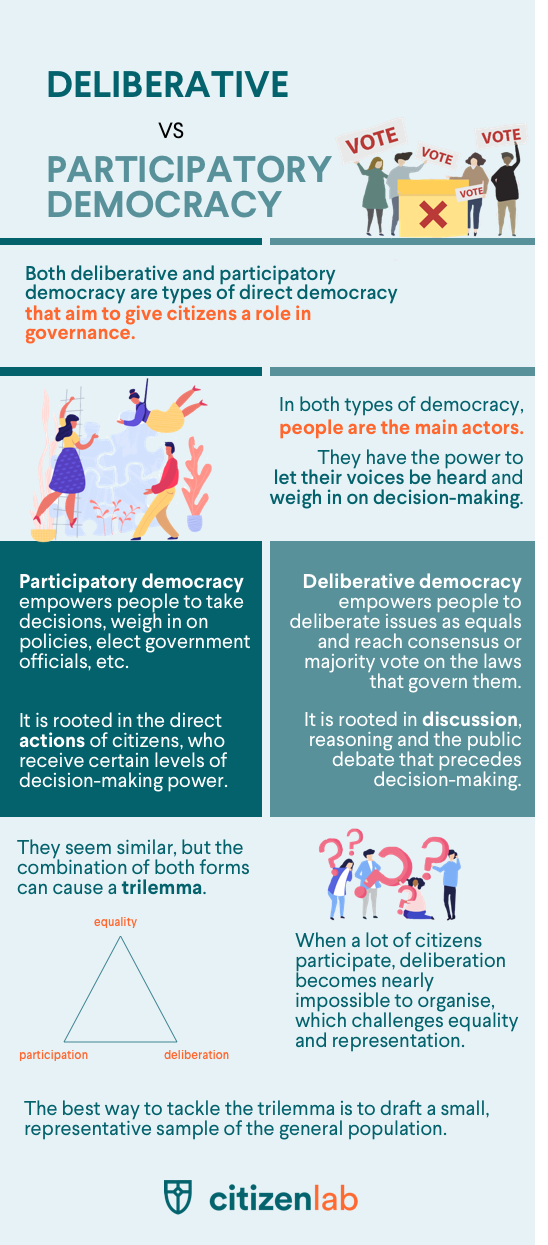 Можно констатировать, что демократия с участием всех заинтересованных сторон (participatory democracy) направлена на то, чтобы дать гражданам возможность действовать, в то время как делиберативная демократия нацелена на достижение консенсуса путем обсуждения, дебатов и информации.