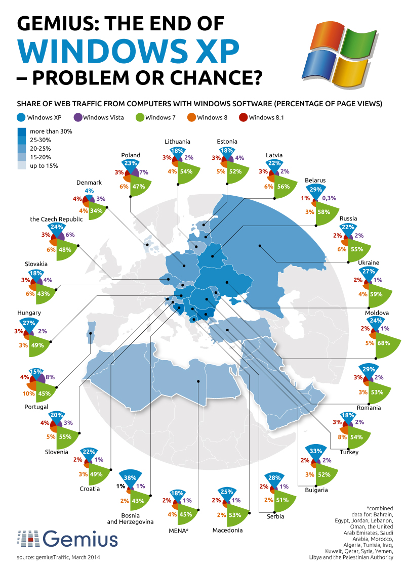 Главная » InternetCEE Инфографика года: посвящается прекращению поддержки Windows XP Автор infopolicy На чтение 1 мин Просмотров 381 Опубликовано 08.04.2014 По результатам исследования gemiusTraffic доли различных продуктов Microsoft в 30 странах: Похожее