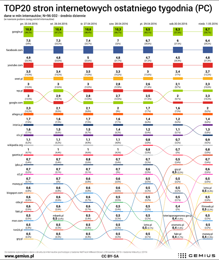 ТОП20 популярных веб-сайтов в Польше на прошлой неделе (25 апреля — 01 мая 2016) согласно данным исследования gemius Audience.