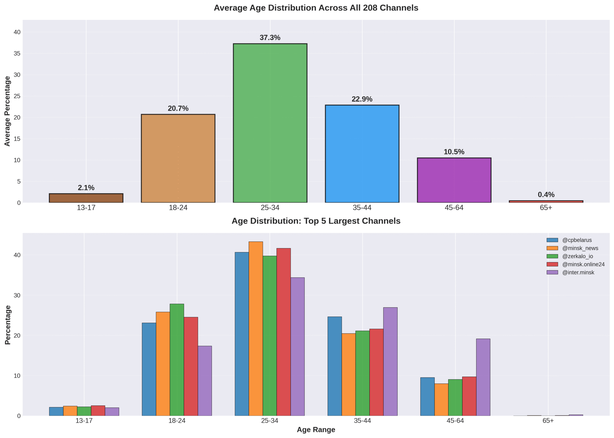 Возрастная воронка демонстрирует четкое исключение старшего поколения. Аудитория старше 65 лет составляет всего 0.4% от общего числа подписчиков, а группа 45-64 года представлена лишь 10.5%. Это означает, что беларуские медиа в Instagram практически не достигают людей старше среднего возраста, которые составляют значительную часть населения страны.