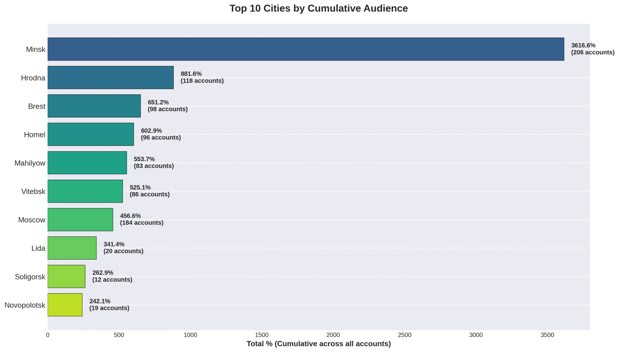 Региональные центры показывают ожидаемое распределение. Гродно занимает второе место с совокупным охватом 881% и присутствием в 118 каналах, что дает среднюю долю 7.5% на канал. За ним следуют Брест (651%, 98 каналов), Гомель (603%, 96 каналов), Могилев (554%, 83 каналов) и Витебск (525%, 86 каналов). Эта иерархия в целом соответствует размерам городов и их экономическому значению.