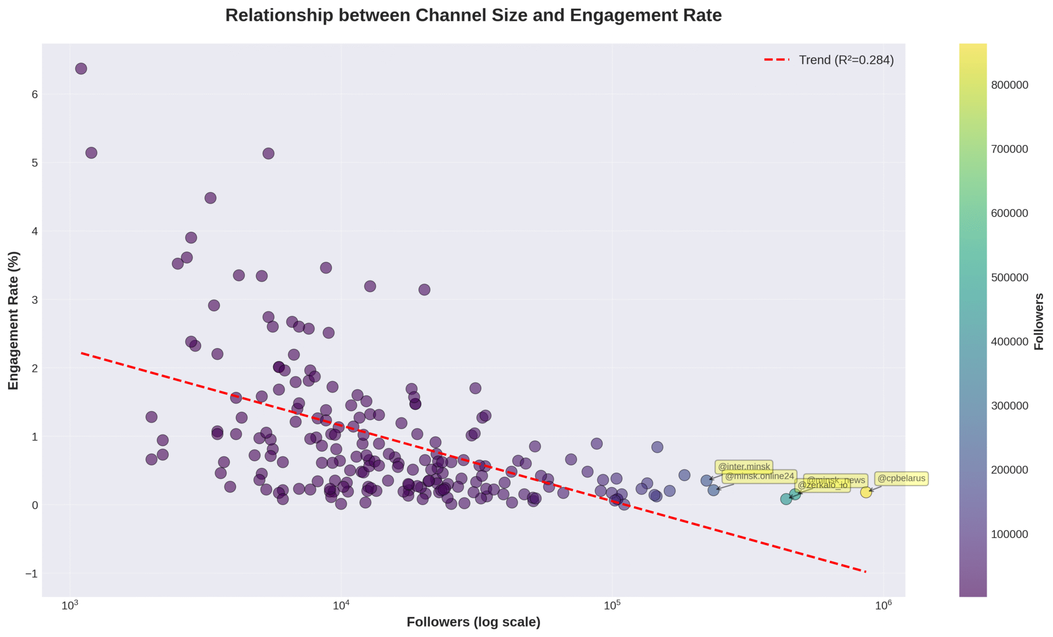 Анализ соотношения между размером канала и уровнем вовлеченности аудитории выявил неожиданную закономерность. Существует отчетливая негативная корреляция с коэффициентом R²=0.284 между количеством подписчиков и engagement rate. Это означает, что по мере роста канала его способность вовлекать аудиторию снижается.