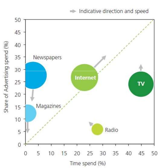 Это ценный график, который показывает, что чем больше пользователи больше тратят времени на определенное медиа, тем больше денег рекламодатели тратят на него.