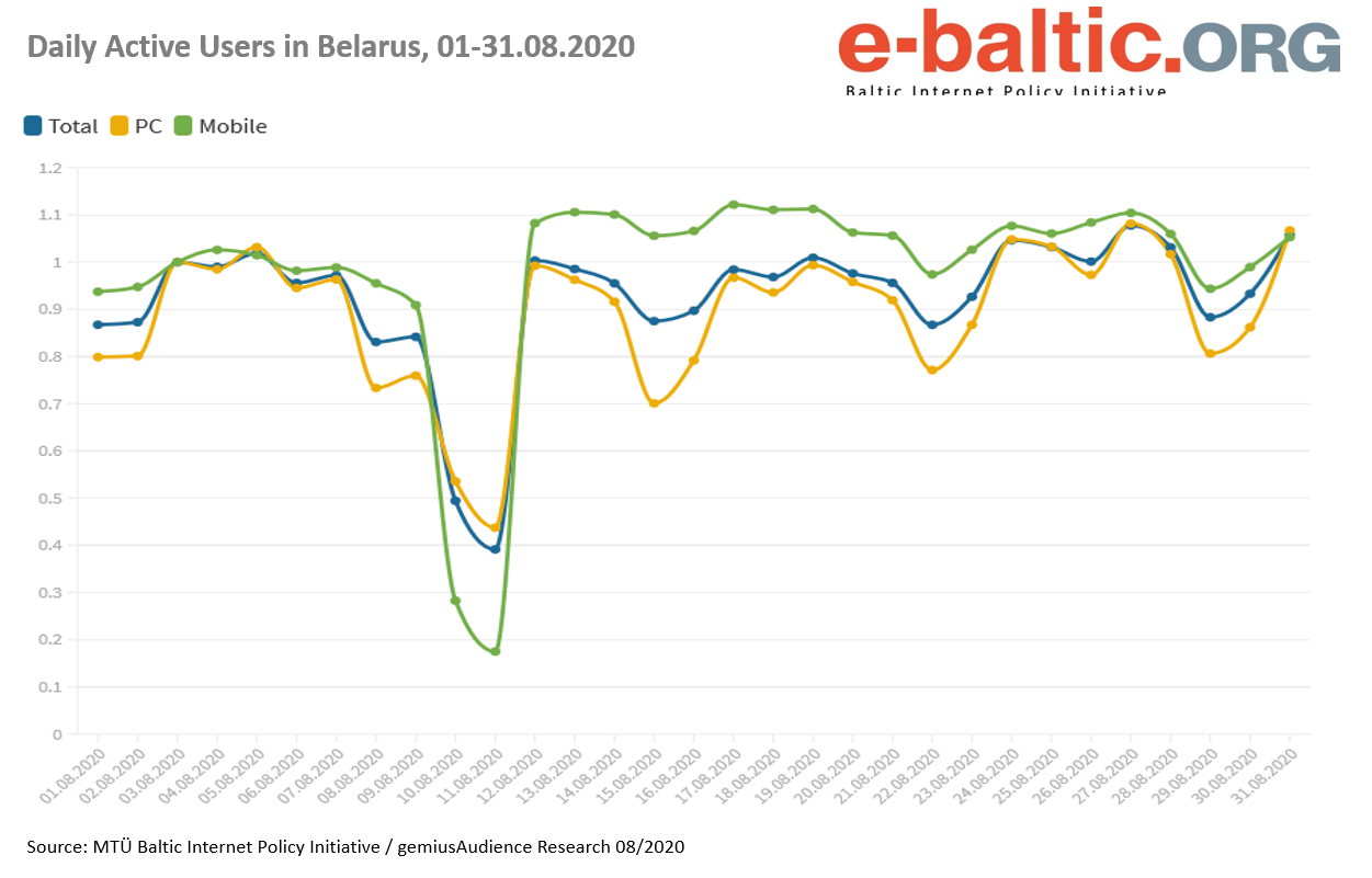 — общая ежедневная беларуская интернет-аудитория (Total) вернулась к показателям начала месяца, несмотря на отключение интернета, блокировки и так далее, 9-11 августа 2020;
