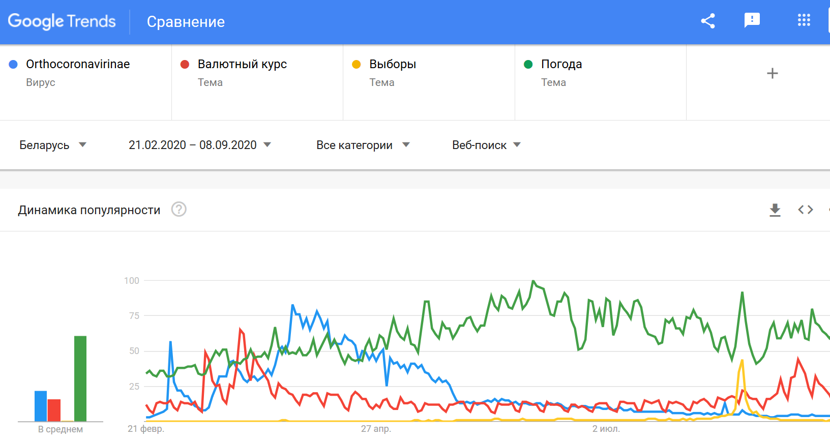 Количество запросов в Google по темам коронавирусной пандемии СOVID-19, валютный курс, выборы, погода