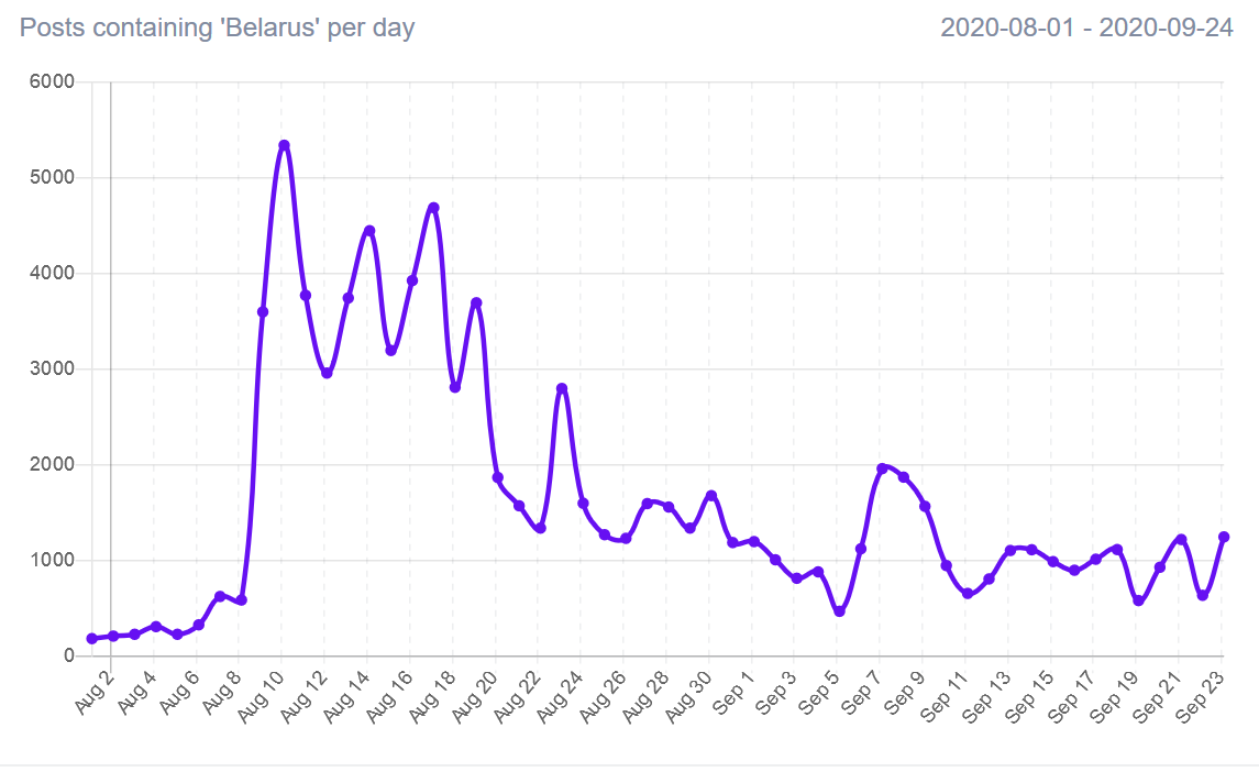 Количество твитов на популярные беларуские хэштеги в августе-сентябре 2020