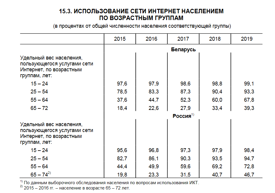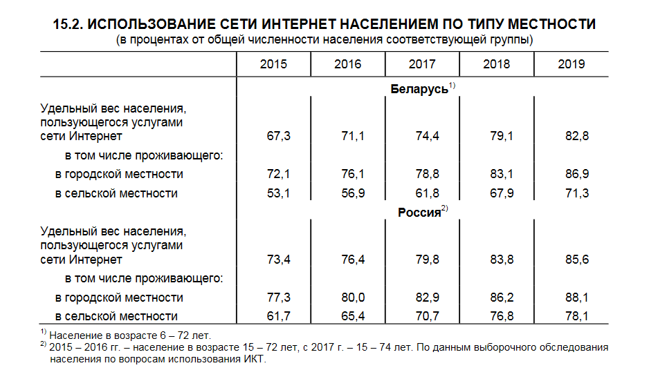 Официальные данные Национального статистического комитета Республики Беларусь по использованию интернета в Беларуси в сравнении с Российской Федерацией.