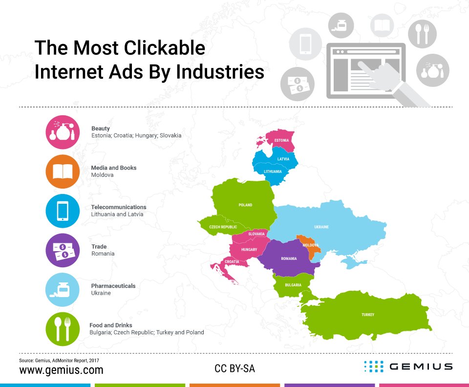 Главная » InternetCEE Кликабельность по индустриям в странах CEE Автор infopolicy На чтение 1 мин Просмотров 457 Опубликовано 18.07.2017 Компанией Gemius подготовлена иллюстрация, наиболее кликабельных или максимальный CTR по различным секторам в странах Центральной и Восточной Европы, на основании данных исследований gemiusDirectEffect и ad-server’а (баннерокрутилки) AdOcean: Похожее