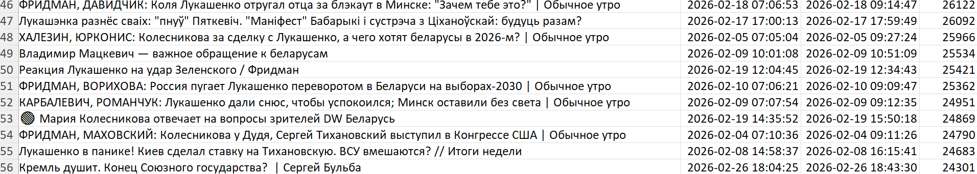 Позиция этого видео среди всех февральских стримов беларуских YouTube-каналов, где последняя колонка число сделанных просмотров на 2026-03-02: