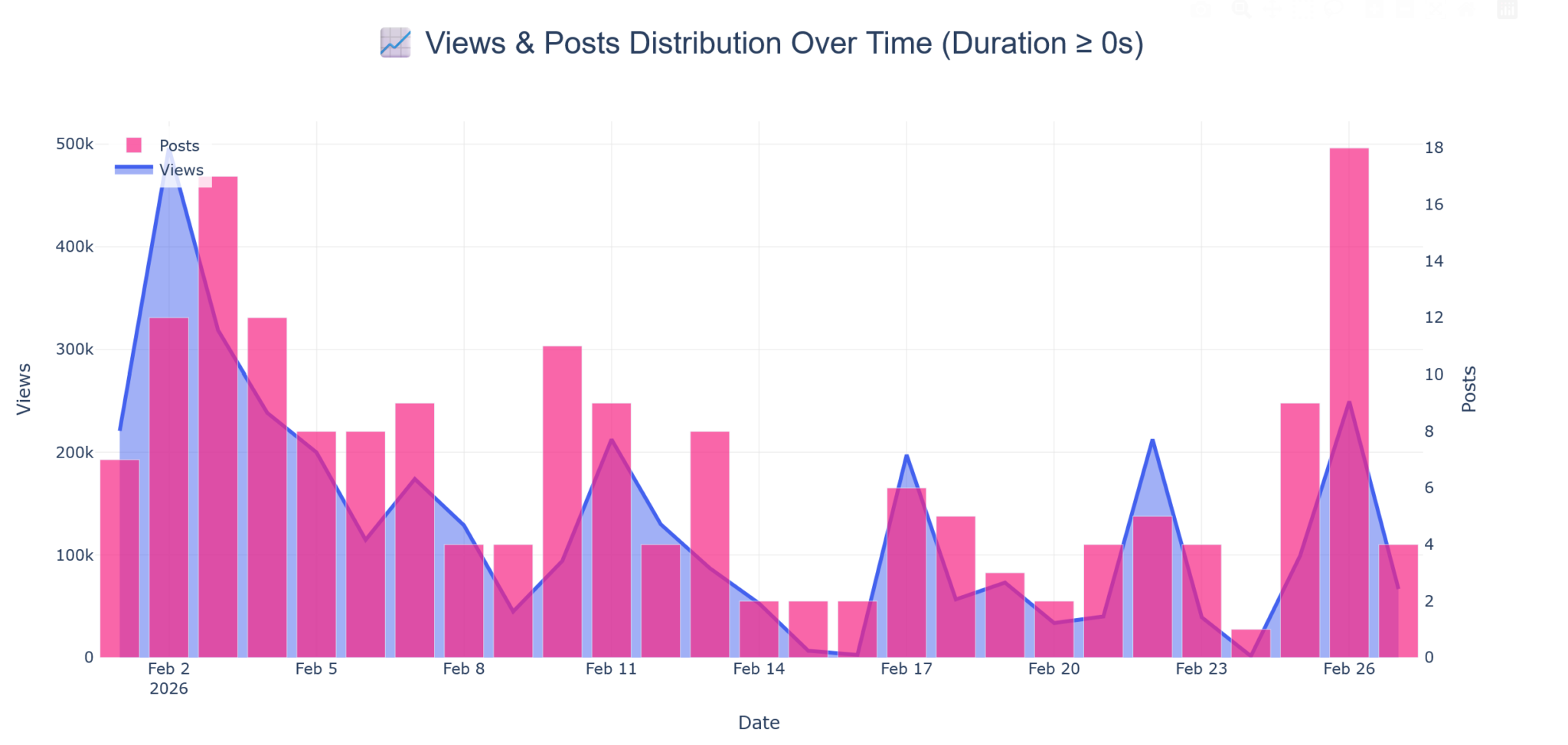 Временная динамика показывает два выраженных пика публикационной активности. Первый и наиболее мощный всплеск приходится на начало февраля (примерно 2–5 февраля), когда число публикаций достигает 16–18 в день, а просмотры превышают 400 тыс. Это совпадает с выходом интервью Колесниковой Дудю и волной реакций на него. Второй значительный пик наблюдается в конце месяца (25–27 февраля), связанный с большим интервью Бабарико «Зеркалу» — здесь просмотры снова поднимаются до 300–400 тыс. В середине месяца (10–18 февраля) активность остаётся умеренной, но не падает до нуля, тема постоянно присутствует в повестке. Характерно, что кривая просмотров не всегда точно повторяет количество постов: бывают дни с небольшим числом видео, но высокими просмотрами, что говорит о том, что отдельные публикации крупных каналов способны генерировать огромный трафик.