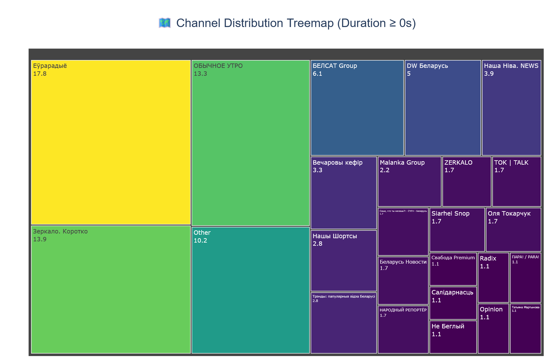 «Дерево» распределения по каналам демонстрирует явную олигополию нескольких медиа. Еўрарадыё доминирует с долей 17,8%, за ним следует ОБЫЧНОЕ УТРО (13,3%) и Зеркало. Коротко (13,9%). Эта тройка совокупно покрывает около 45% всех публикаций по теме. Группа БЕЛСАТ (объединяя БЕЛСАТ NOW, БЕЛСАТ SHORTS, БЕЛСАТ LIFE) даёт ещё 6,1%. DW Беларусь (5%) и Наша Ніва. NEWS (3,9%) замыкают первый эшелон. Примечательно, что Зеркало. Коротко при высокой частоте постов работает в формате коротких нарезок — это объясняет большое количество единиц контента при относительно скромных просмотрах. Категория «Other» (10,2%) указывает на длинный хвост небольших каналов, которые тоже подхватывают тему, но каждый по отдельности производит лишь 1–2 видео.