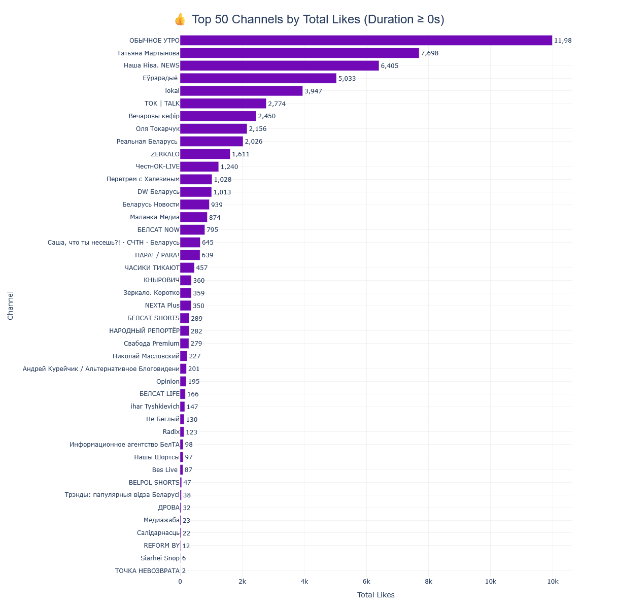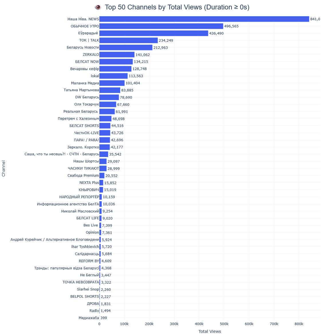 ОБЫЧНОЕ УТРО (496,5 тыс.) и Еўрарадыё (436,5 тыс.) формируют второй эшелон, и это логично: оба канала являются лидерами по числу публикаций (13,3% и 17,8% соответственно). Однако разница между ними показательна: Еўрарадыё производит значительно больше контента, но собирает меньше просмотров, чем ОБЫЧНОЕ УТРО. Это подтверждает паттерн, видимый и по лайкам: аудитория ОБЫЧНОГО УТРА более сконцентрирована и активна.