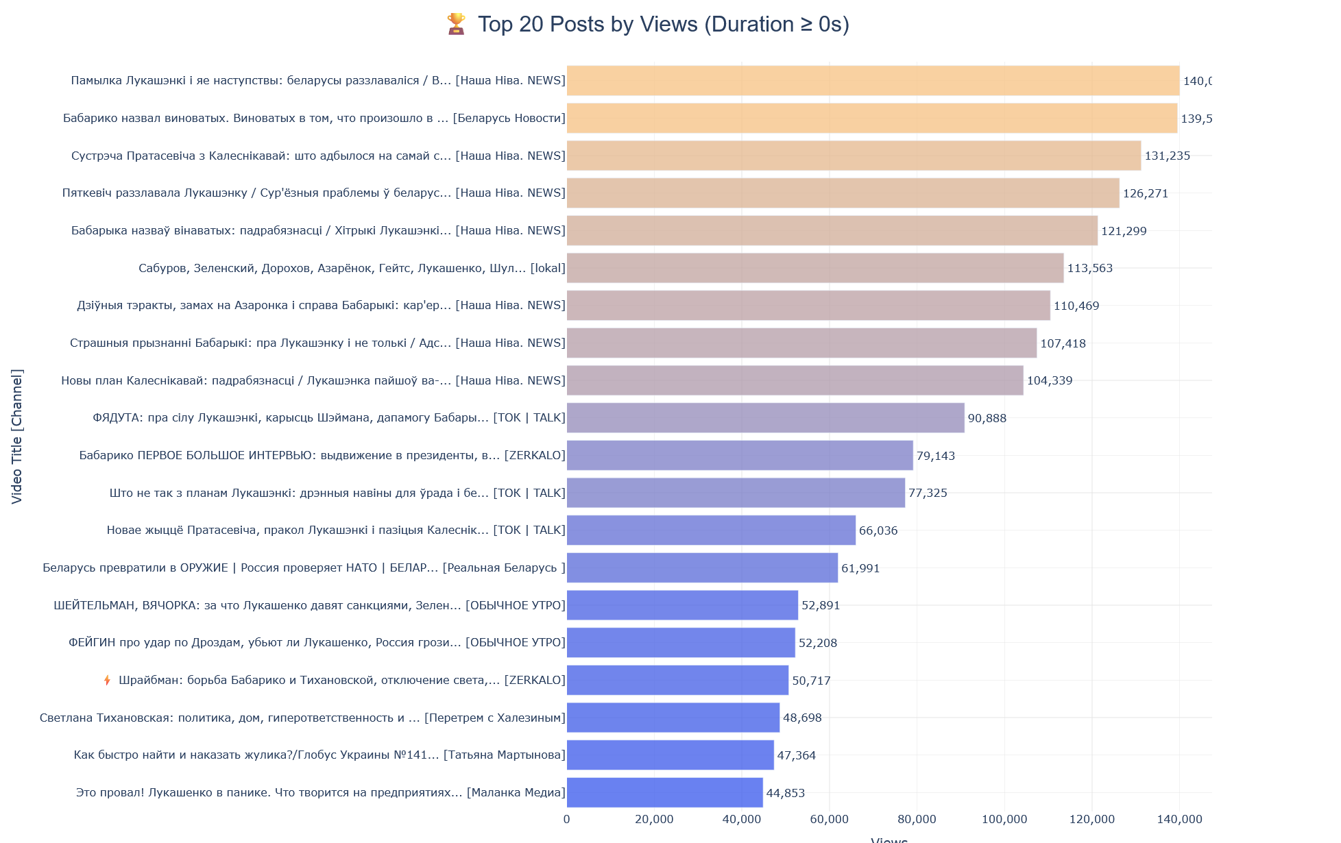 Рейтинг самых просматриваемых видео однозначно показывает доминирование Наша Ніва. NEWS: шесть из двадцати самых просматриваемых видео принадлежат этому каналу, причём лидер списка («Памылка Лукашэнкі і яе наступствы») набрал ~140 тыс. просмотров. Второе место у канала «Беларусь Новости» с видео «Бабарико назвал виноватых» (~139,5 тыс.). На третьем месте: Наша Ніва с материалом о встрече Протасевича с Колесниковой (~131 тыс.). Показательно, что lokal с единственным попавшим видео (Сабуров, Зеленский, Дорохов…) собрал ~113 тыс. — это развлекательный контент, где упоминание Колесниковой было лишь частью более широкой повестки. Большое интервью Бабарико на ZERKALO набрало ~79 тыс., а выпуск Шрайбмана о борьбе Бабарико и Тихановской — ~50,7 тыс. Вывод: белорусскоязычные каналы (Наша Ніва) генерируют наибольший охват по теме, а русскоязычные аналитические программы (ОБЫЧНОЕ УТРО, Зеркало) обеспечивают глубину дискуссии.