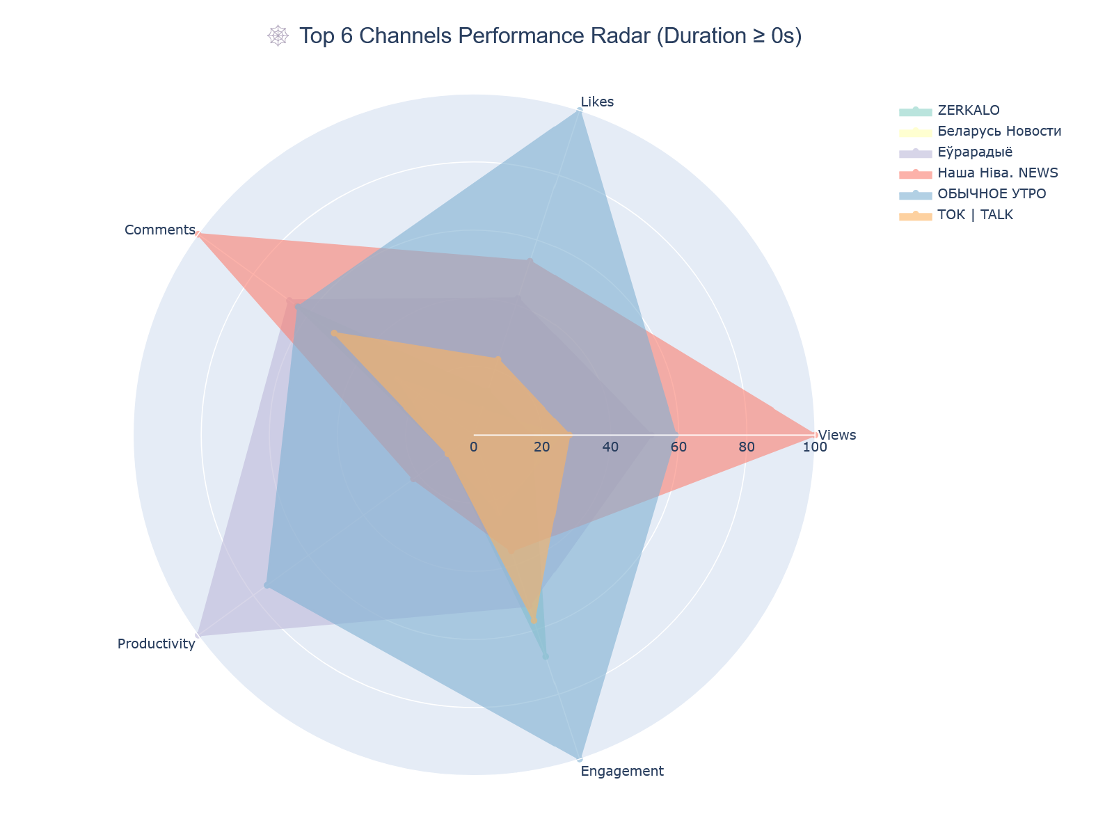 Радарная диаграмма шести ведущих каналов — это пожалуй, самая информативная визуализация. Наша Ніва. NEWS доминирует по комментариям и сильна по просмотрам, но уступает по продуктивности (количеству публикаций). ОБЫЧНОЕ УТРО выделяется по лайкам и продуктивности, формируя сбалансированный профиль. Еўрарадыё показывает высочайшую продуктивность, но отстаёт по вовлеченности канал производит много контента, но каждая единица собирает относительно скромный отклик. ZERKALO демонстрирует сбалансированный профиль с сильными позициями по просмотрам и вовлеченности, но меньшим объёмом публикаций. «Беларусь Новости» выделяется по просмотрам, но слабее по комментариям: аудитория канала скорее потребляет, чем обсуждает. ТОК | TALK показывает компактный, но заметный профиль с хорошим балансом всех метрик.