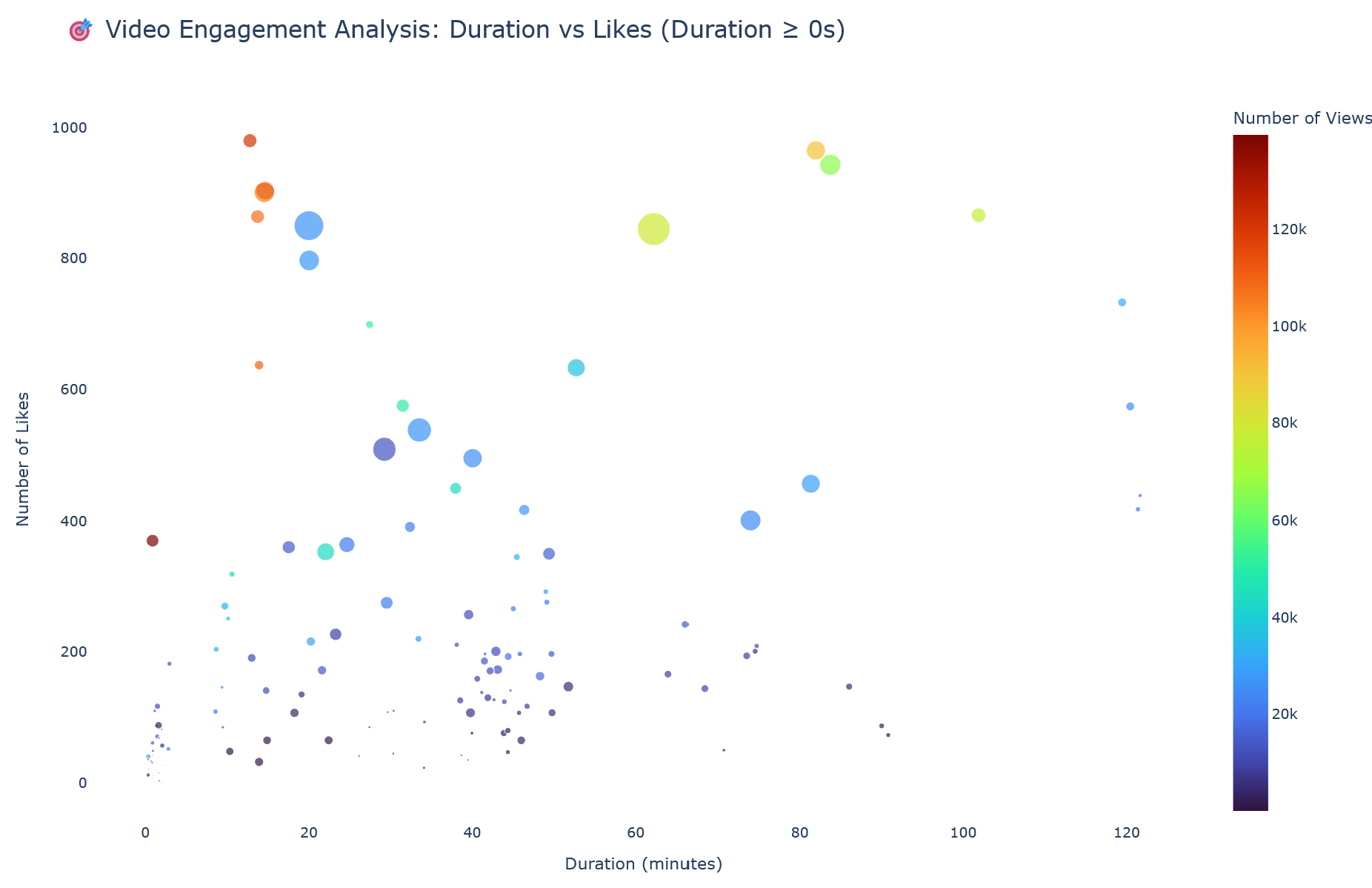 График длительности против лайков выявляет несколько кластеров. Основная масса видео сосредоточена в зоне 10–40 минут и 0–400 лайков — это «рабочая лошадка» новостного YouTube. Однако наиболее успешные по лайкам видео (800–1000+) распределены в двух группах: короткие (до 15 минут) и длинные (60–80 минут). Короткие с высоким числом лайков — это эмоциональные реакции и нарезки ключевых моментов. Длинные — полные интервью (Бабарико на Зеркале, Колесникова у Дудя), которые при значительном хронометраже всё равно генерируют высокую вовлечённость. Цветовая кодировка по просмотрам показывает, что самые просматриваемые видео (тёплые тона) не обязательно самые «лайкаемые»: аудитория массовых каналов более пассивна, тогда как нишевые каналы с меньшим охватом имеют более активных зрителей.