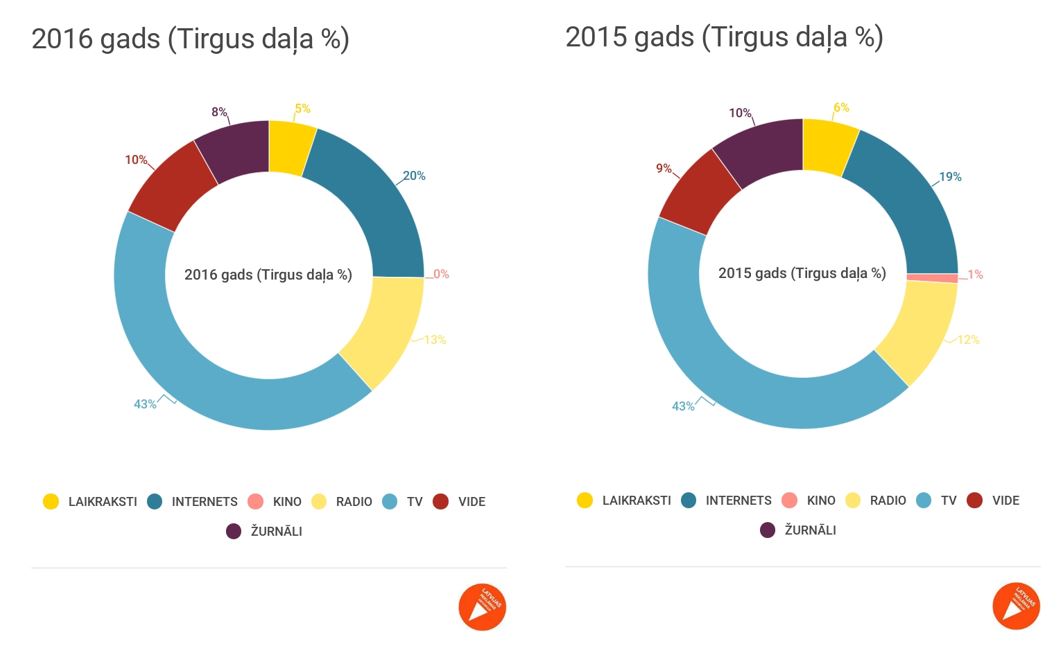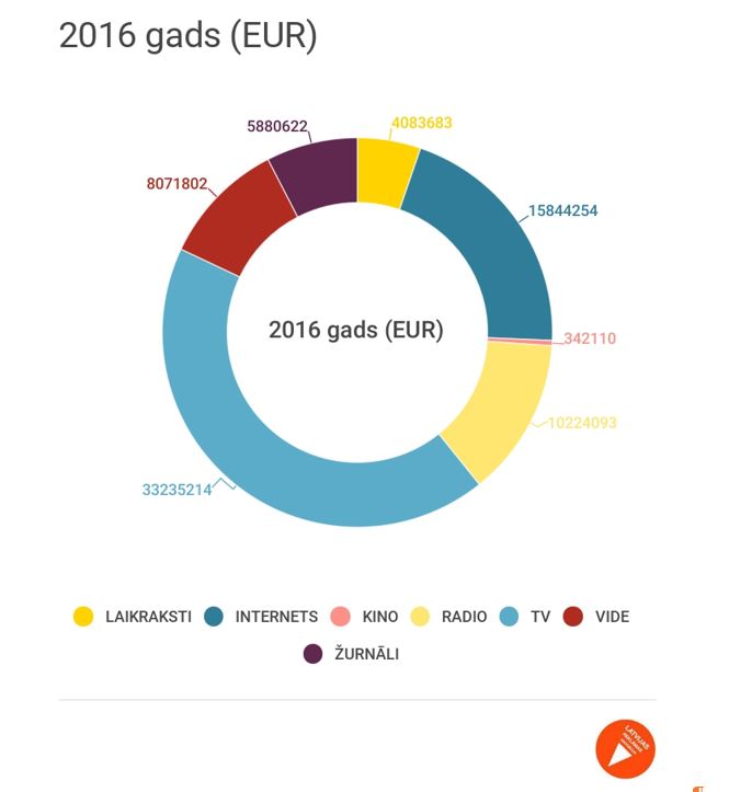 Рекламный рынок Латвии в 2016 году составил — 77,6 миллиона евро по данным Latvijas Reklāmas asociācija (LRA).