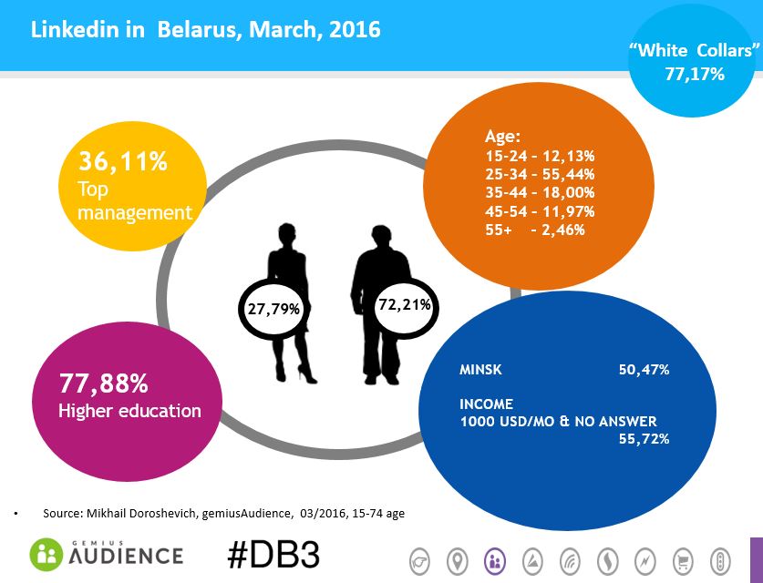Linkedin всегда был недооценен в беларуском интернет-рекламном бизнесе, хотя социальная сеть имеет небольшую, но очень качественную аудиторию. Посмотрим на основные характеристики Linkedin в Беларуси: