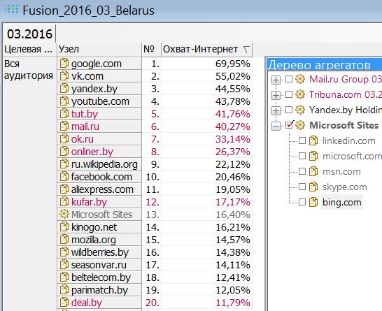 Следующая история — это интернет-активы Microsoft в Беларуси. Конечно, Linekdin имеет охват всего 2,18% или 111 тысяч человек, но общая аудитория: MSN.com, windows.com, live.com, skype.com, bing.com и linkedin с учетом пересечения аудиторий, составляет 16,40% всей беларуской интернет-аудитории или 834 тысячи человек, что позволяет находиться в топ20 самых популярных ресурсов: