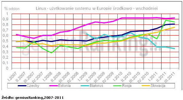 Нашел интересный график про Linux на основе данных gemiusRanking, которые получаются из веб-аналитического исследования Gemius — gemiusTraffic: