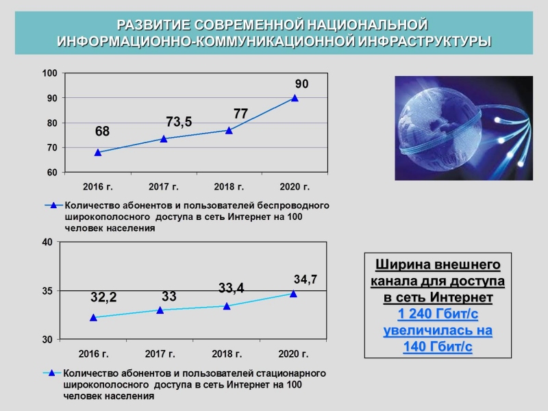 Быстрые темпы внедрения сетей по технологии GPON позволяют оказывать услуги передачи данных на скорости до 100 Мбит/с. Количество абонентов, подключенных по технологии GPON, увеличилось на 610 тыс. абонентов и по состоянию на начало текущего года составило 1 млн. 700 тыс. абонентов.