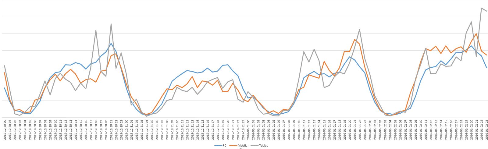 Главная » Беларусь Новогодний трафик белорусских интернет-пользователей Автор infopolicy На чтение 1 мин Просмотров 366 Опубликовано 06.01.2016 Замечательная картина по различным устройствам благодаря исследованию gemiusPrism. Можно насладиться всеми временными перепадами и различиями в поведении использования разных устройств (PC, Mobile, Tablet): И отдельная тема — это SmartTV: Похожее