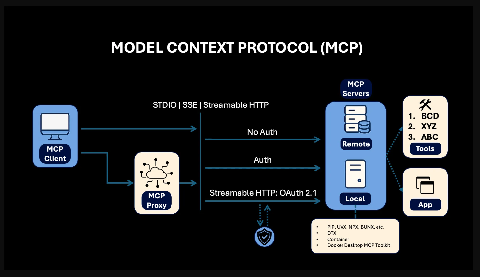 - MCP Proxy: преобразует транспортные протоколы MCP, например, STDIO ⇄ SSE.