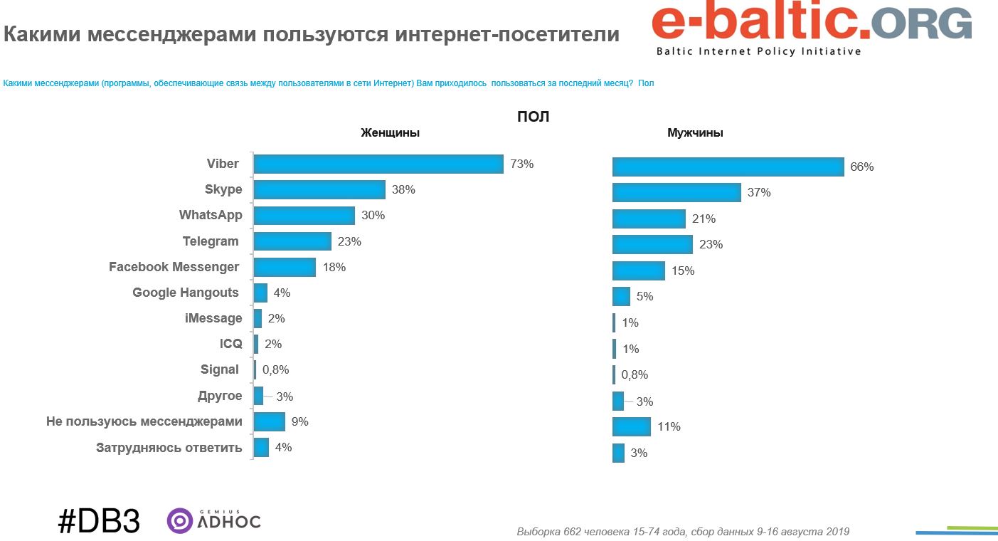 Если оценивать по возрасту, то пользование Viber среди опрошенных в возрасте 25-44 года составляет более 80%. Telegram’ом более 50% в возрасте 15-24 года, а вот Skype’ом — 46% в возрасте 55-74 года.