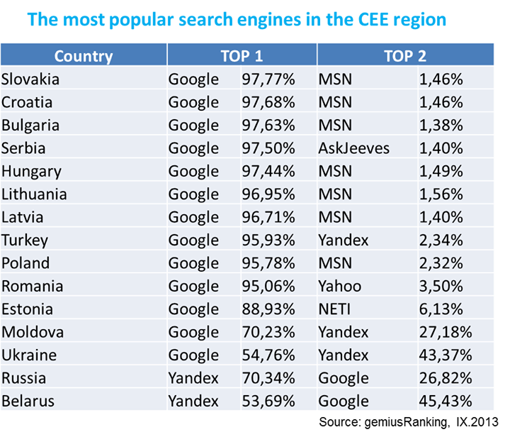 Главная » InternetCEE Популярные поисковые системы в Центральной и Восточной Европе Автор infopolicy На чтение 1 мин Просмотров 454 Опубликовано 17.10.2013 Самая интересная ситуация в Беларуси: никто не доминирует. Каждую неделю все меняется. Источник: http://rankingcee.com/ Похожее