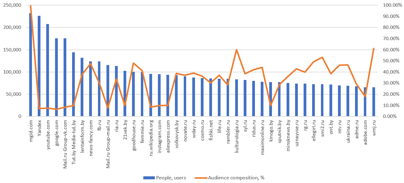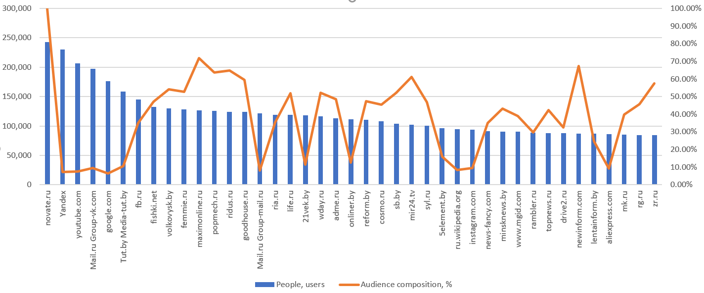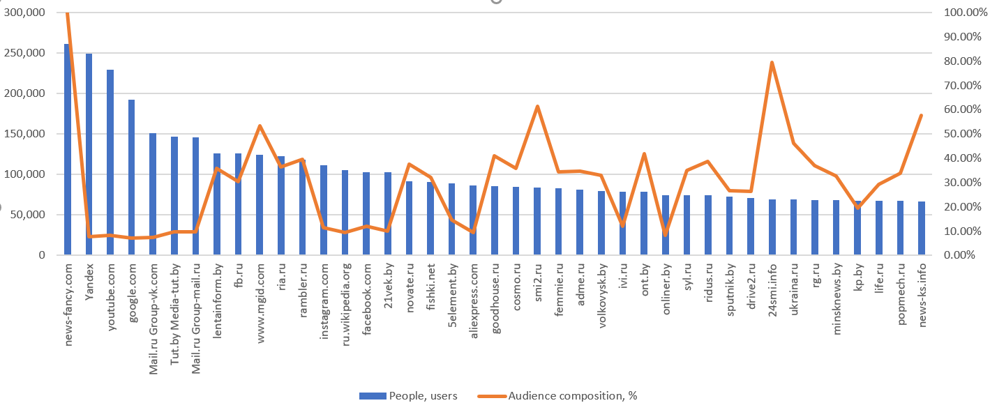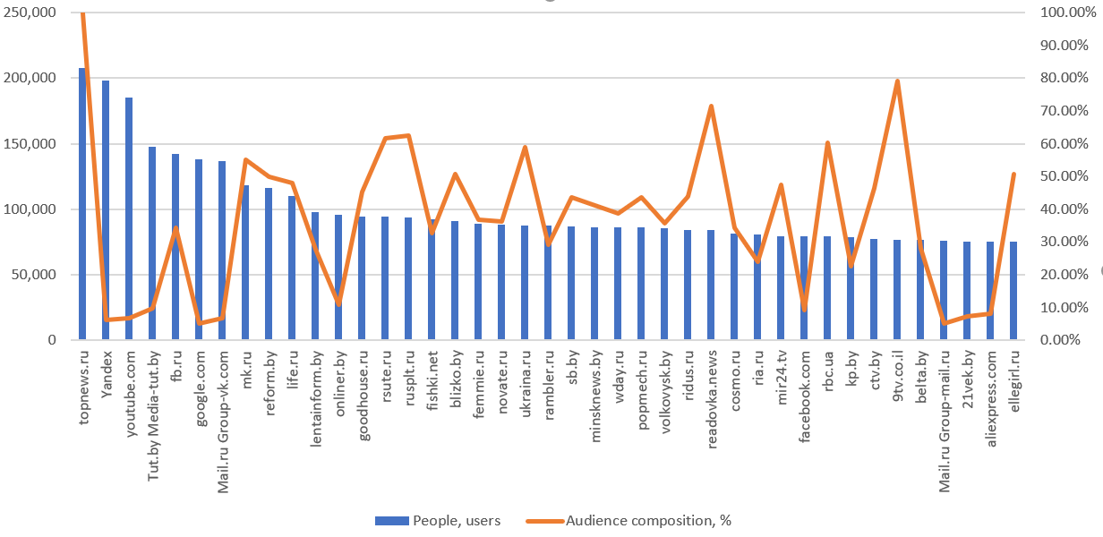 Большее пересечение с новостными ресурсами, такими как mk.ru, reform.by, life.ru и русскоязычным израильским телеканалом — 9tv.co.il. Если посмотреть социально-демографические характеристики данного сайта, то 30% аудитории проживает в Минске и 25,5% в малых городах и сельской местности.
