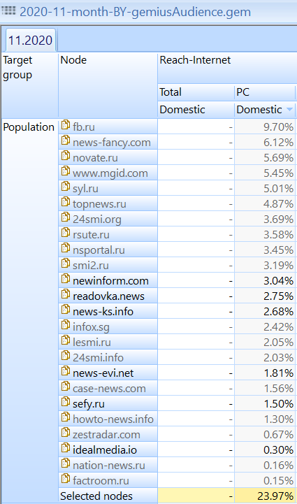 Общий охват, с учетом пересечения аудиторий сервисов, составил 23,97%, т.е. каждый четвертый беларуский компьютерный пользователь в возрасте 15-74 года посещал хотя бы раз в течение ноября 2020 один из представленных ресурсов. В людях — это 1,023,939 человек.