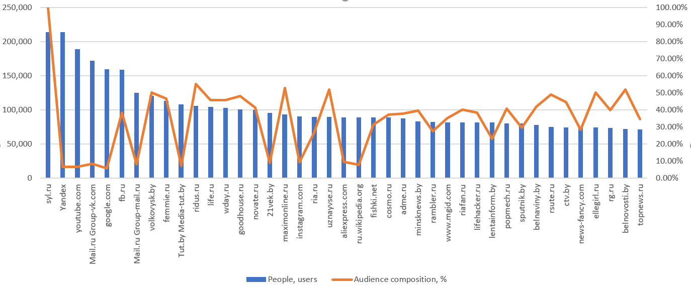 В данном случае обращает внимание кроме пересечения с аудиториями онлайн версий глянцевых изданий maximonline.ru, femmie.ru, popmech.ru, опережающих социальные медиа и крупные порталы, так и пересечение рядом находящихся по sb.by, mir24.tv.