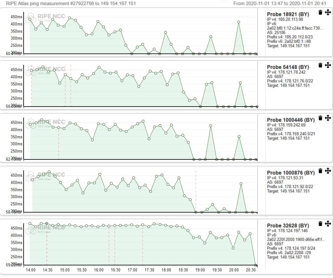 Мы продолжим следить за этой ситуацией и вы можете нам помочь. Если у вас есть доступный домашний или офисный сервер — установите специальный софт для замеров RIPE ATLAS Probe: https://atlas.ripe.net/docs/software-probe/. Чем больше проб в разных местах и у разных провайдеров, тем проще будет наблюдать за блокировками и недоступностью сетей в Беларуси. Сейчас в Беларуси всего 24 активных проба, которые установлены у 13 провайдеров. В России, например, 500 активных пробов, а в Украине 200.