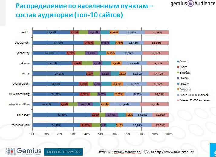 Хорошую картинку подброшу, вполне себе свежую — из апрельских данных исследования gemiusAudience. В Минске находится только 29% белорусской интернет-аудитории.