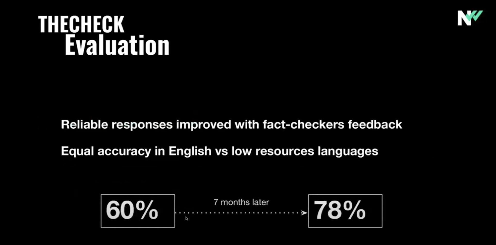 (4:05) И для этого мы установили такие параметры, как, например, содержал ли он неверную (4:10) информацию, были ли источники релевантны вопросу, был ли ответ ясным и (4:17) последовательным. (4:18) И к настоящему моменту мы добились повышения точности, достоверности с учетом (4:25) отзывов специалистов по проверке фактов, и мы добились равной точности на английском языке по сравнению с (4:30) языками с низкими ресурсами, которые мы использовали. (4:34) На данный момент, спустя семь месяцев с начала проекта, мы увеличили точность (4:39) с 60 до 78 %.