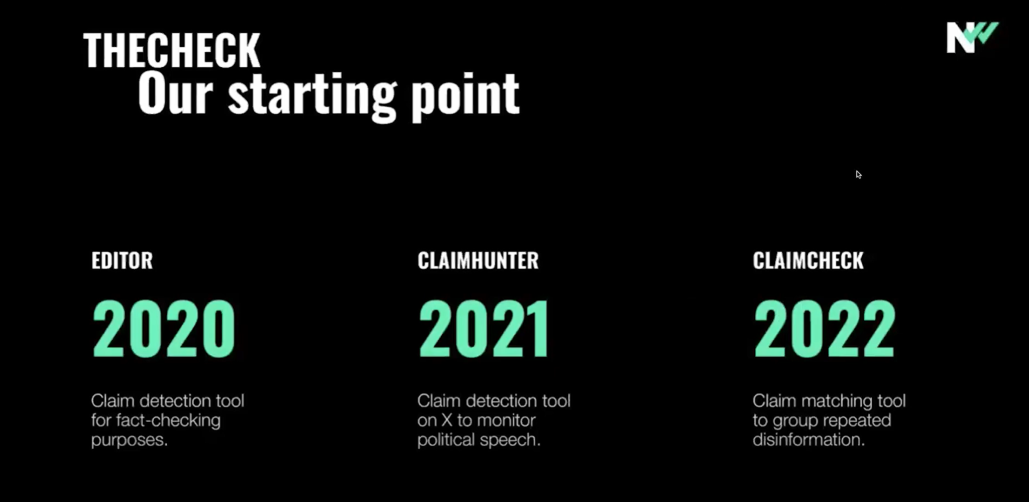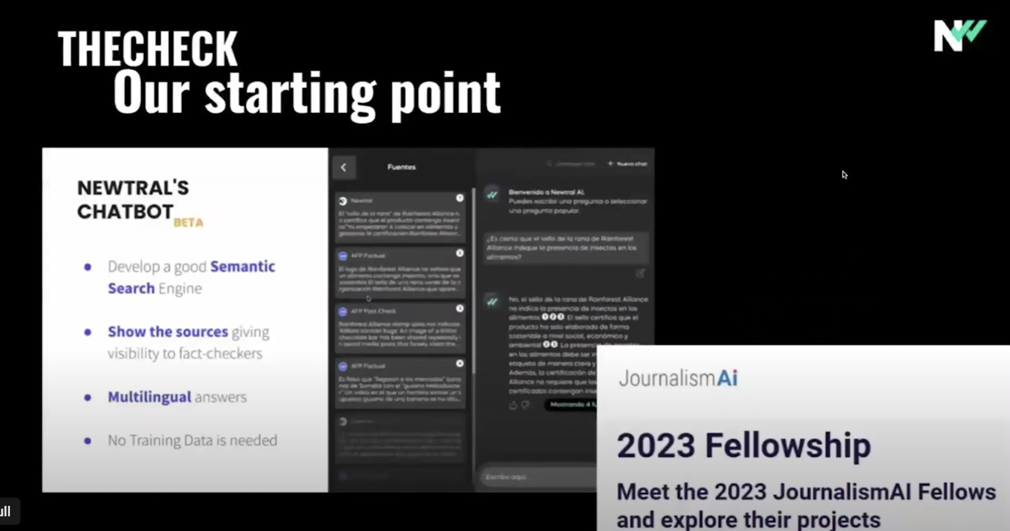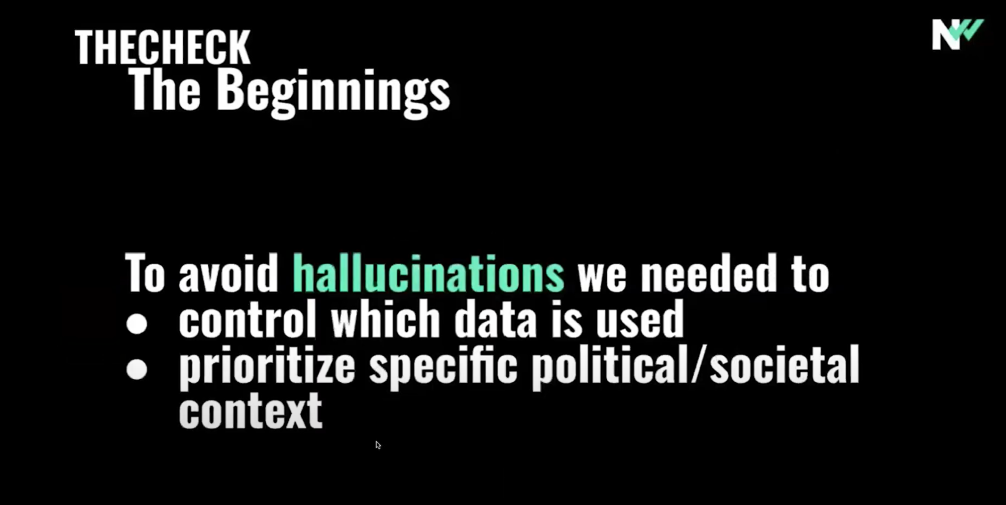 (1:24) Но я должен сказать, что мы не начинаем с нуля, с самого начала существования компании (1:30) у нас была команда инженеров, работающая над автоматизацией процесса проверки фактов, мы (1:35) создали инструменты для проверки фактов, обнаружения в плоскости, сопоставления в плоскости, а в прошлом году, с помощью (1:42) стипендии от Journalist AI, мы начали развивать проект с использованием больших (1:48) языковых моделей для создания этого чатбота, который я представляю сегодня.