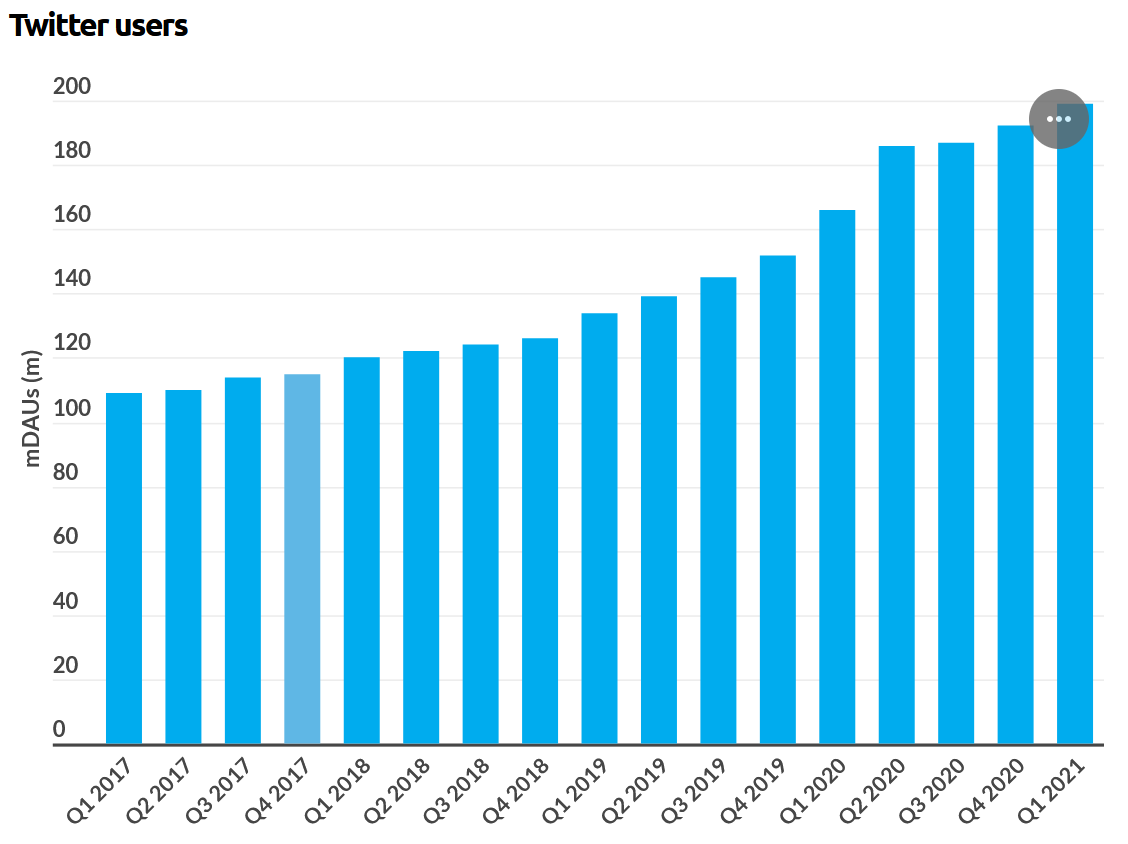Twitter имеет около 200 миллионов Daily Active Users — DAU (ежедневных пользователей). Twitter обеспечивает доступ к знаменитостям, компаниям, политикам, который раньше был невозможен. Теперь люди могут твитнуть прямо на аккаунты, на которые они подписаны, и напрямую общаться с людьми, к которым раньше они были недоступны.