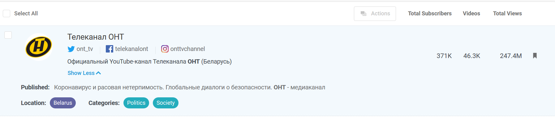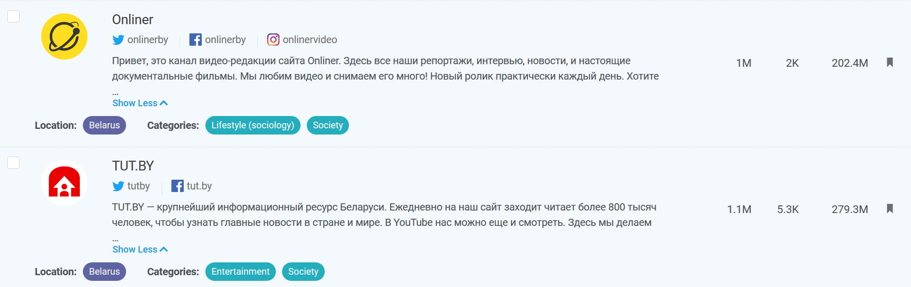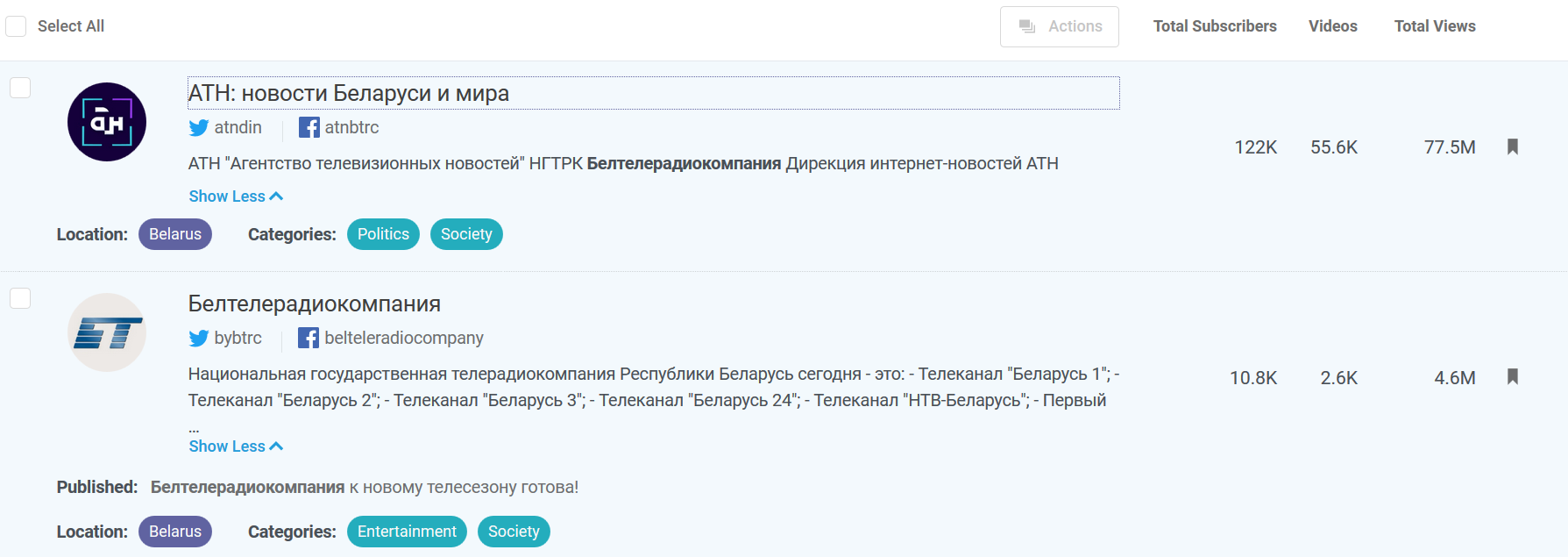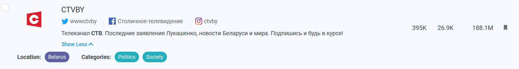 Рассмотрим каналы беларуских телеканалов по степени влиятельности (influence), используя данные сервиса мониторинга социальных медиа Buzzsumo.