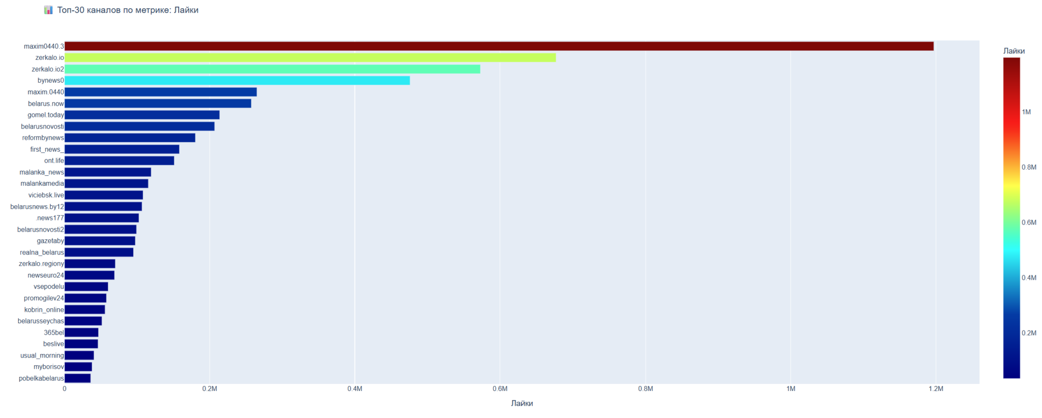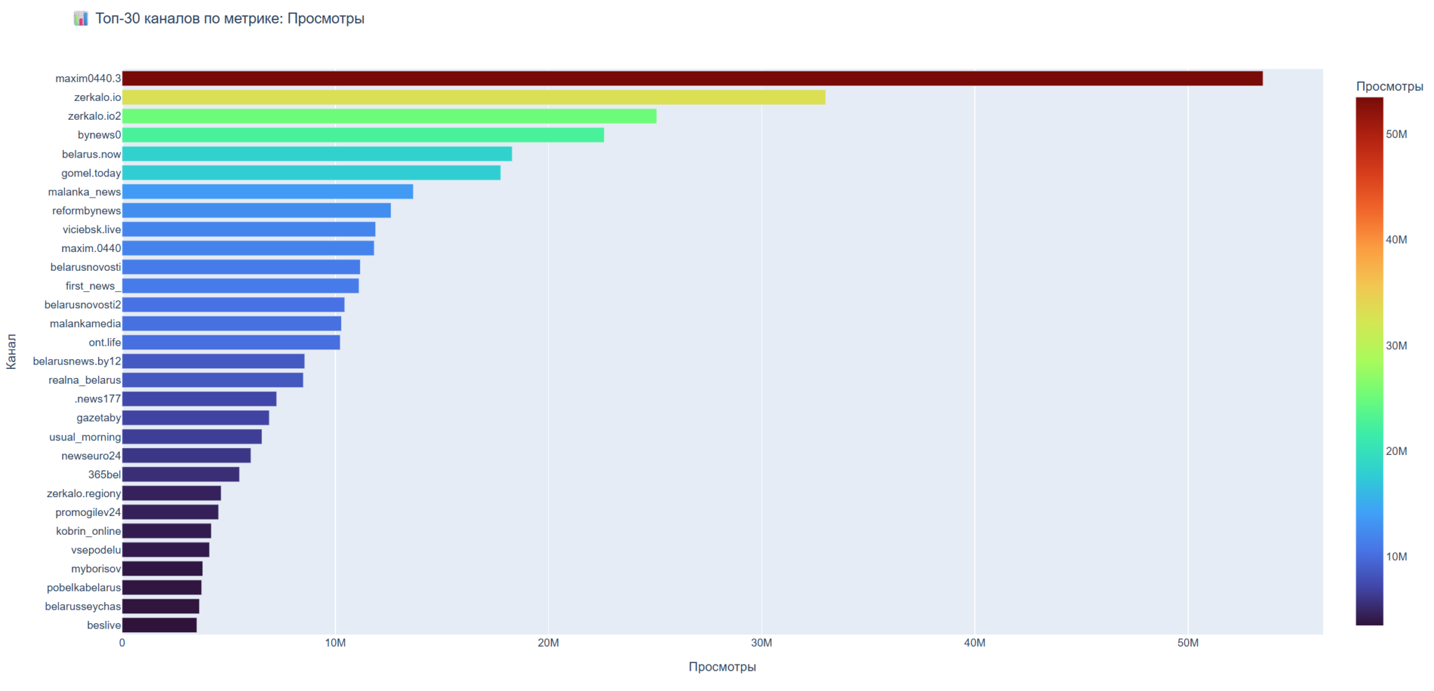 Важным наблюдением является то, что в лидерах по просмотрам находятся каналы, ориентированные не исключительно на белорусскую аудиторию, что говорит о трансграничном характере информационного потребления и влияния региональных медиа на более широкую русскоязычную аудиторию в TikTok.