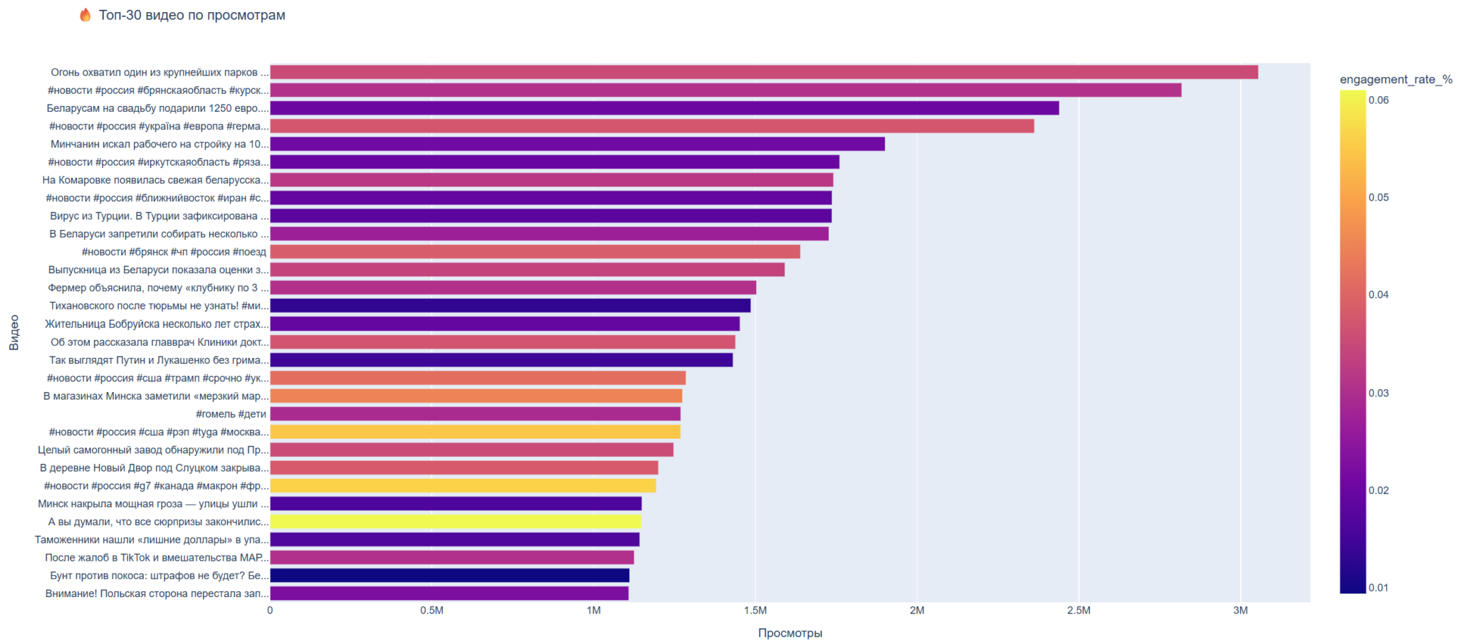 Примечательно, что порог входа в топ-30 наиболее просматриваемых видео превышает 1 миллион просмотров, что указывает на высокие стандарты качества и релевантности контента в белорусском сегменте. Это также свидетельствует о том, что белорусская аудитория TikTok достаточно велика и активна, чтобы генерировать такие высокие показатели вовлеченности.
