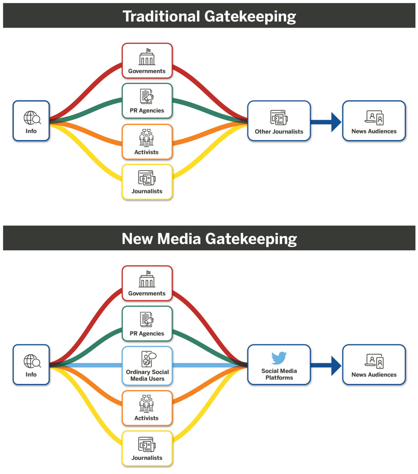— Использование таких платформ, как Twitter, для сбора новостей нарушает традиционные процессы контроля над новостями. Журналисты теперь имеют доступ к широкому спектру неэлитных источников, идей для сюжетов и контента из источников, выходящих за рамки правительств, PR-фирм и других новостных организаций.