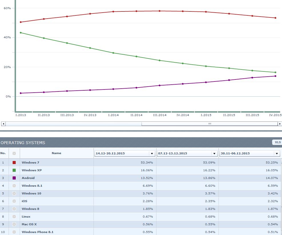 Еженедельный график исследования gemiusRanking показывает, что это может произойти в первом квартале 2016. Android обойдет по количеству просмотров страниц операционную систему — Windows XP.
