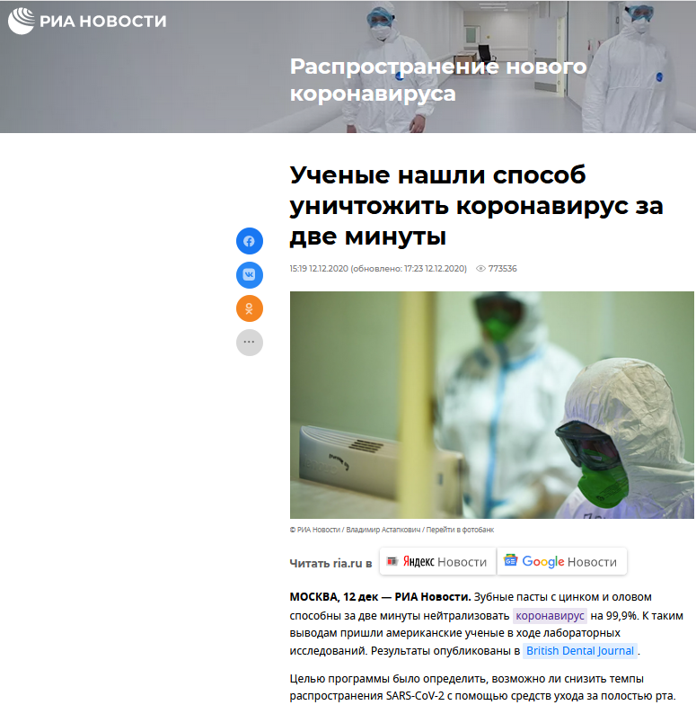 Итак, РИА Новости запустили информацию 12 декабря 2020, что «Зубные пасты с цинком и оловом способны за две минуты нейтрализовать коронавирус на 99,9%. К таким выводам пришли американские ученые в ходе лабораторных исследований. Результаты опубликованы в British Dental Journal. Целью программы было определить, возможно ли снизить темпы распространения SARS-CoV-2 с помощью средств ухода за полостью рта».
