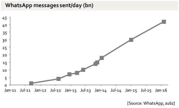 Главная » Mobile WhatsApp vs SMS Автор infopolicy На чтение 1 мин Просмотров 835 Опубликовано 03.02.2016 Глобально SMS системы обрабатывают 20 миллиардов сообщений в день. WhatsApp — 42 миллиарда. С 57 инженерами. График роста: Похожее