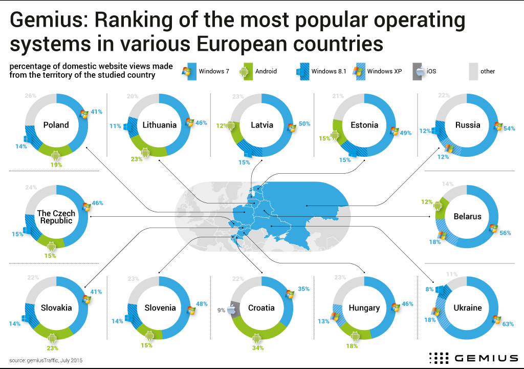 Microsoft недавно запустил официальную версию новейшего программного обеспечения — Windows 10. Компания Gemius решила проанализировать данные по самым популярным операционным системам в двенадцати отдельных странах: Польше, Чехии, Словакии, Венгрии, Эстонии, Латвии, Литве, Беларусе, Украине, России, Словении и Хорватии. Данные в анализе за июль 2015 года по просмотрам страниц на локальных веб-сайтах, совершенных на территории анализируемой страны.