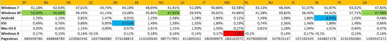 Как видно только три страны: Беларусь, Болгария и Венгрия, где основное количество просмотров делается с помощью устройств, использующих операционную систему Windows XP. В Украине произошло важное событие, как раз на прошлой неделе: количество просмотров с помощью Windows 7 обогнало Windows XP.