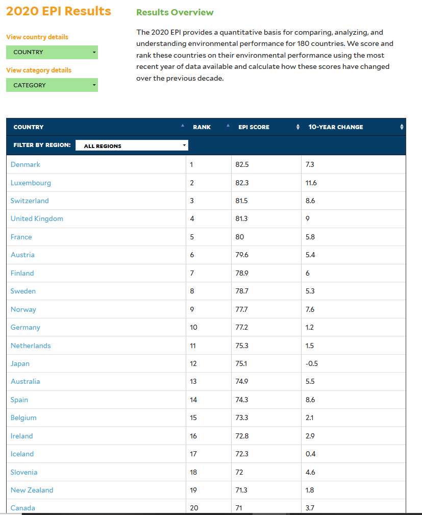 Индекс экологической эффективности (EPI) рассматривает устойчивость во всем мире. Он ранжирует страны – 180 из них по экологическому здоровью и жизнеспособности их экосистем.